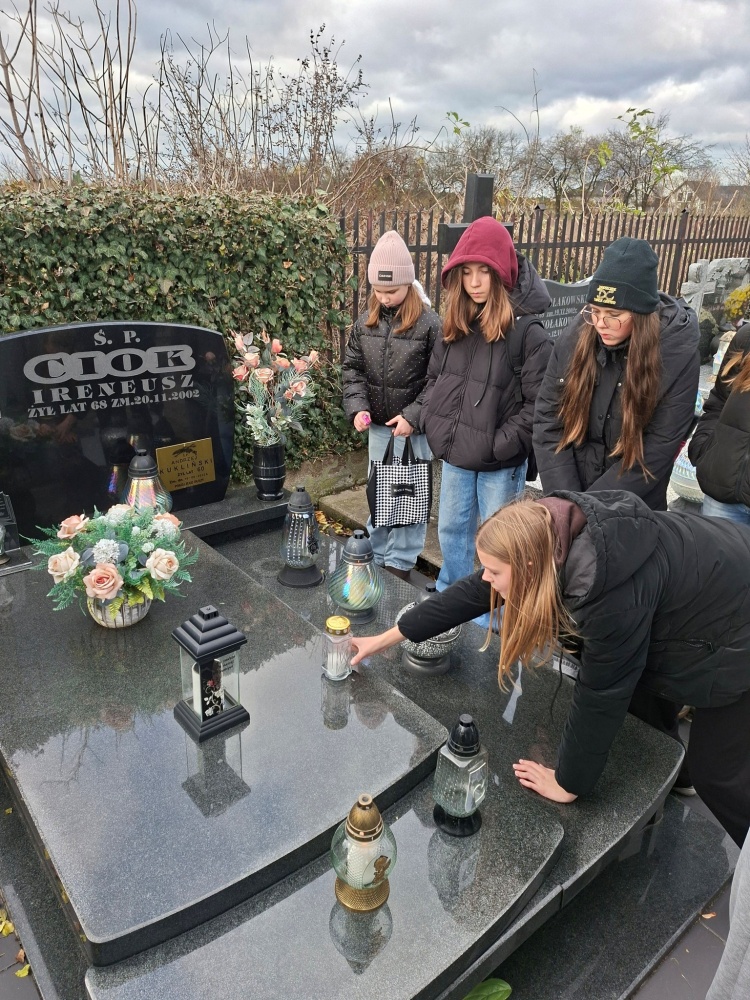 Uczniowie odwiedzili miejscowy cmentarz. Celem wizyty było zapalenie zniczy na grobach żołnierzy oraz zmarłych nauczycieli - tych, którzy przez lata służyli społeczności szkolnej i lokalnej swoją wiedzą, pasją i poświęceniem.