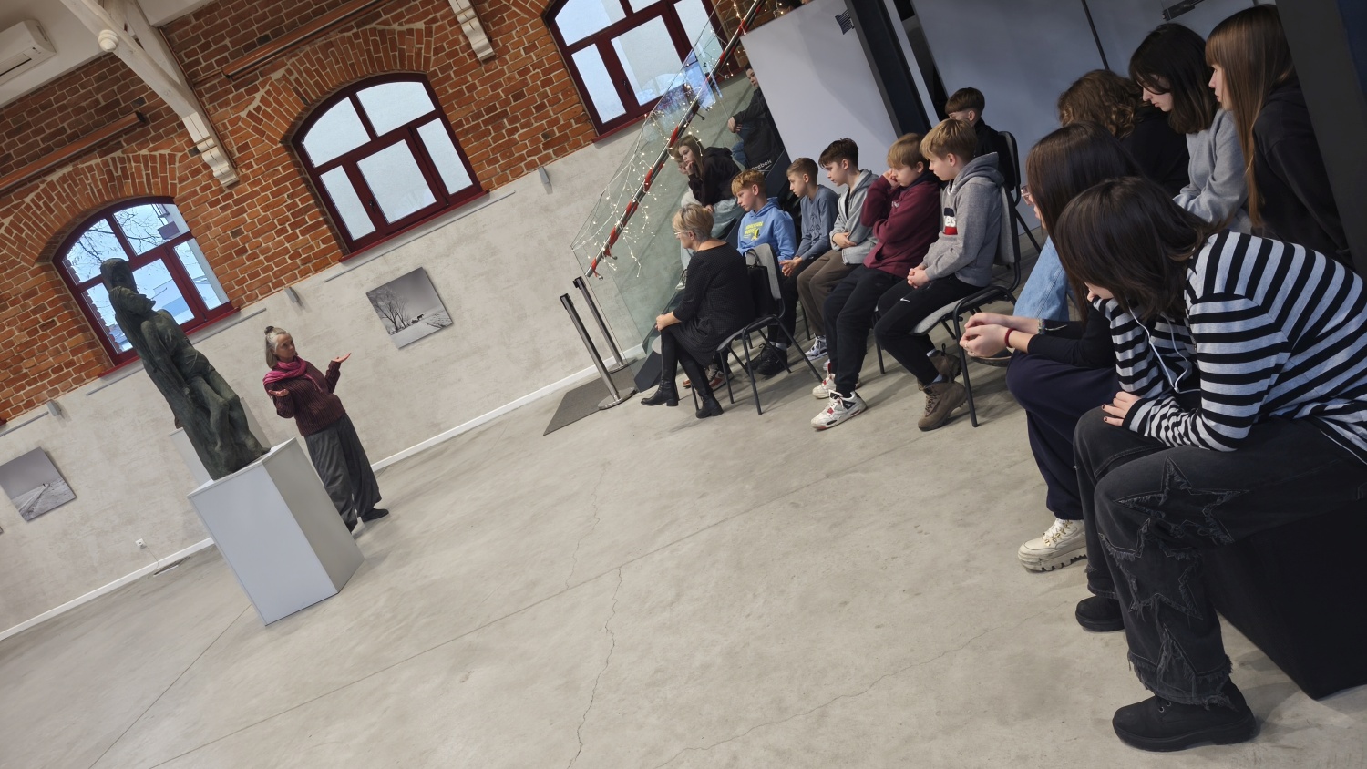 Oprowadzanie kuratorskie Magdy Rząsy po wystawie "Rząsa. Antoni - rzeźba. Halina - fotografia" okazało się dla uczniów Zespołu Szkolno-Przedszkolnego w Ostrowi Mazowieckiej niezwykłą lekcją sztuki i wrażliwości. W Galerii Jatki młodzi odbiorcy poznali nie tylko rzeźby i fotografie wybitnej zakopiańskiej rodziny artystów, lecz także ich historię, emocje i sposób patrzenia na świat, który do dziś inspiruje kolejne pokolenia.