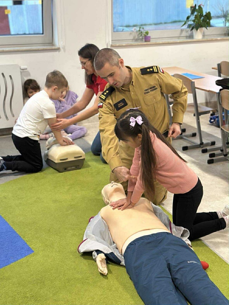 Jak zachować się w sytuacji zagrożenia i jak pomóc innym? Odpowiedzi na te pytania poznali uczniowie klasy IB podczas wyjątkowego spotkania z przedstawicielami Państwowej Straży Pożarnej. Zajęcia, które odbyły się 12 grudnia w Zespole Szkolno-Przedszkolnym w Ostrowi Mazowieckiej, połączyły teorię z praktyką, ucząc dzieci zasad bezpieczeństwa pożarowego oraz udzielania pierwszej pomocy.