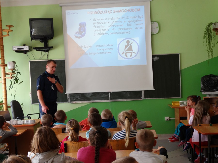 Bezpieczeństwo w trakcie drogi do szkoły było tematem spotkania uczniów klas 1-3 oraz przedszkolaków z policjantem Zespołu ds. Nieletnich.