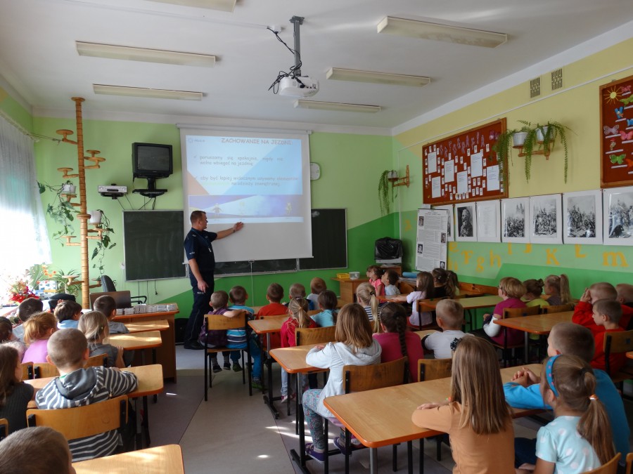Bezpieczeństwo w trakcie drogi do szkoły było tematem spotkania uczniów klas 1-3 oraz przedszkolaków z policjantem Zespołu ds. Nieletnich.