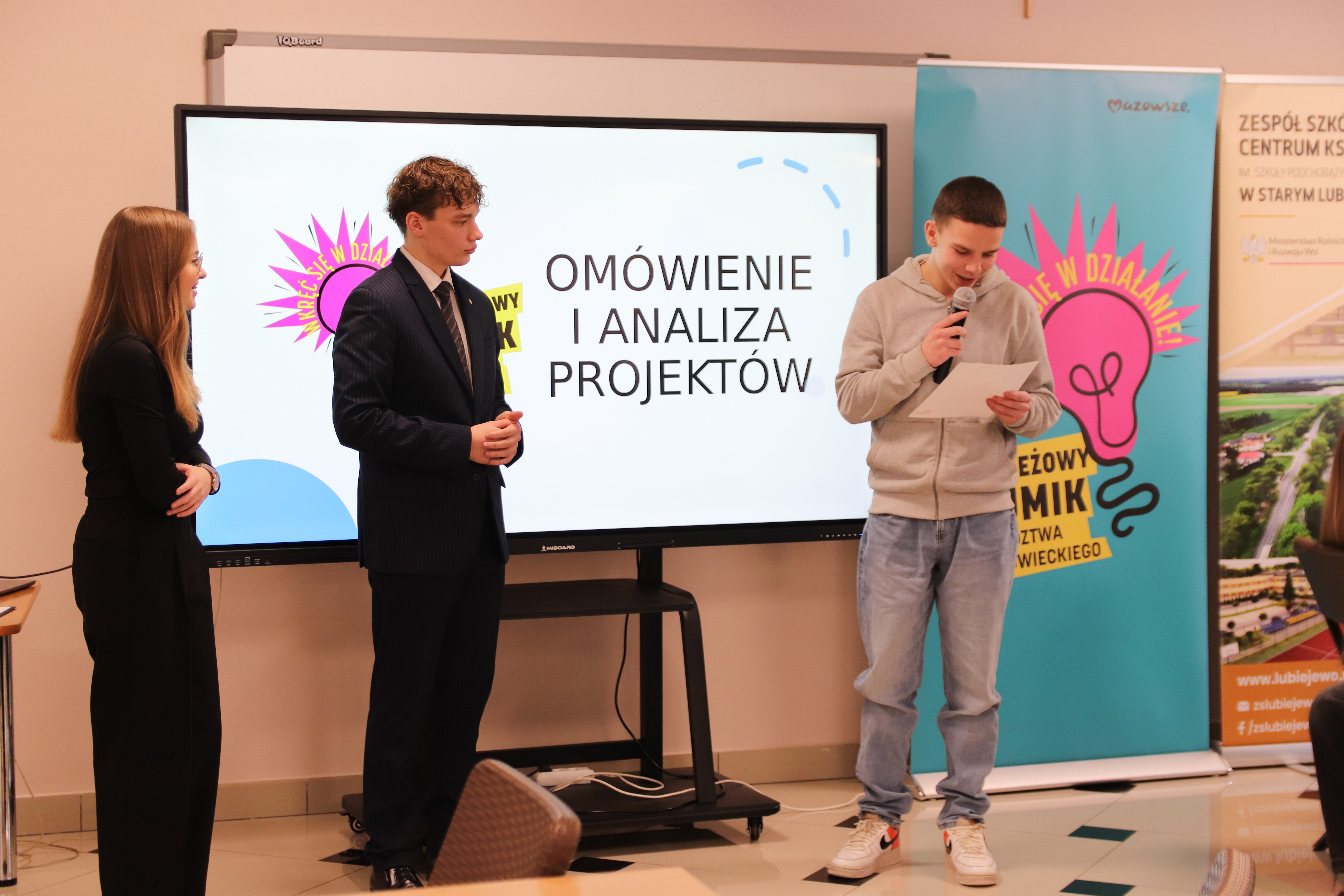 Starosta, wójt, sekretarz miasta - po jednej stronie. Uczniowie szkół podstawowych i średnich - po drugiej.