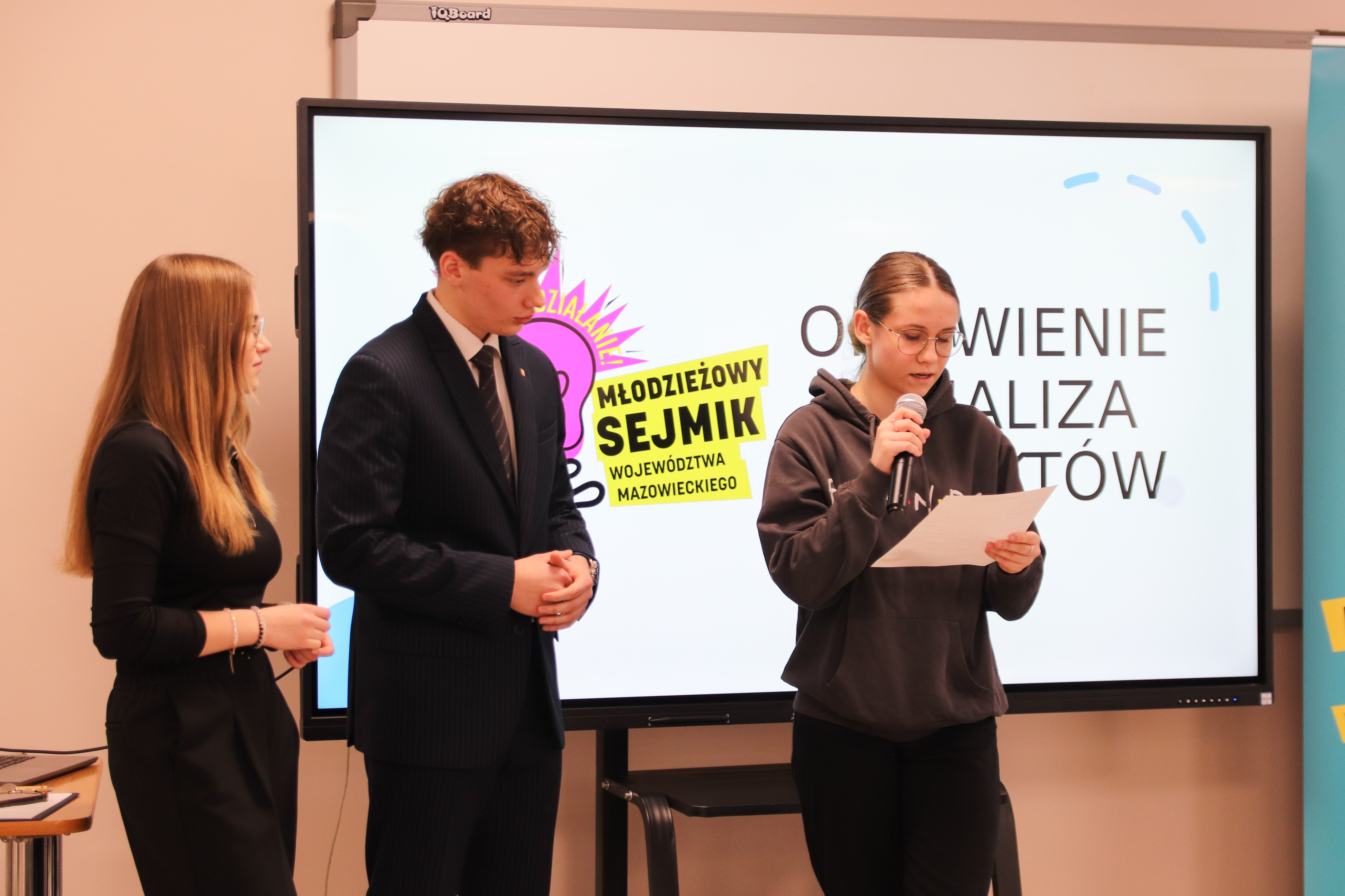 Starosta, wójt, sekretarz miasta - po jednej stronie. Uczniowie szkół podstawowych i średnich - po drugiej.