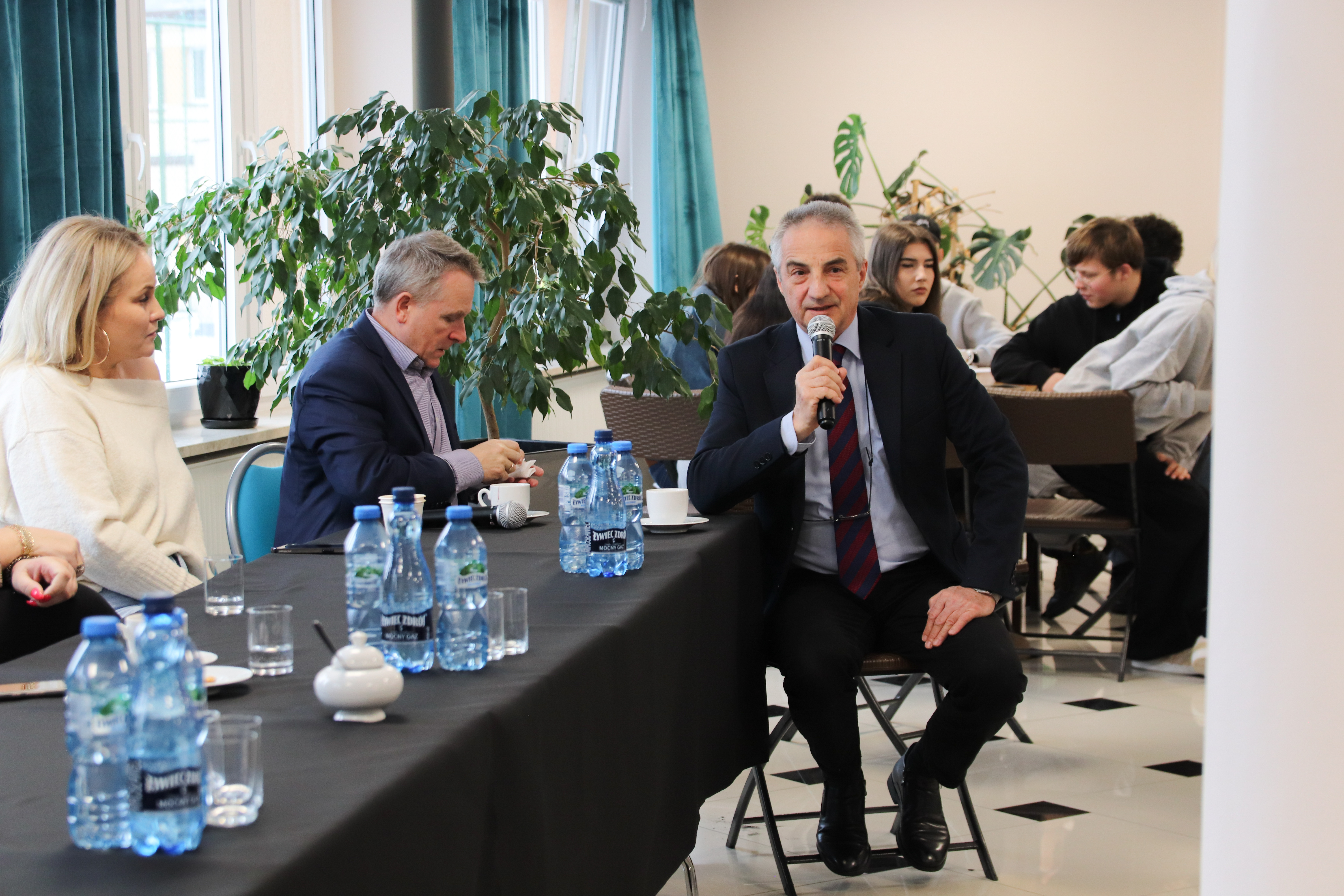 Starosta, wójt, sekretarz miasta - po jednej stronie. Uczniowie szkół podstawowych i średnich - po drugiej.