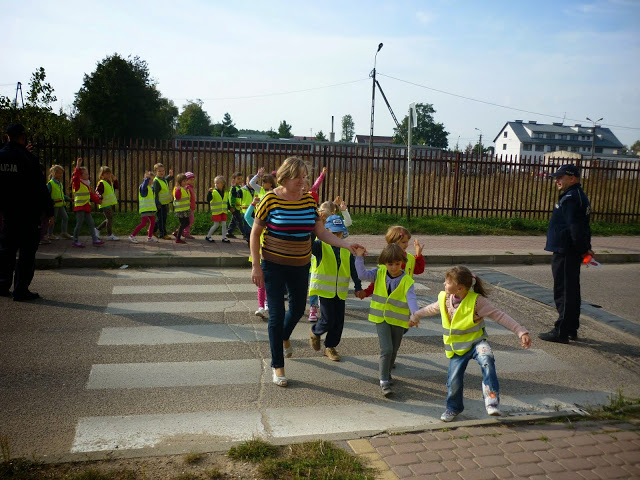 Celem spotkania było wyjaśnienie i przybliżenie dzieciom podstawowych zasad o ruchu drogowym: jak bezpiecznie przechodzić przez jezdnię, jak zachować się w pobliżu jezdni idąc chodnikiem, a jak korzystać z poboczy jezdni, na których chodnika nie ma.