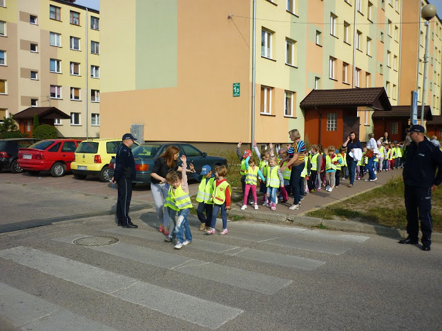 Celem spotkania było wyjaśnienie i przybliżenie dzieciom podstawowych zasad o ruchu drogowym: jak bezpiecznie przechodzić przez jezdnię, jak zachować się w pobliżu jezdni idąc chodnikiem, a jak korzystać z poboczy jezdni, na których chodnika nie ma.