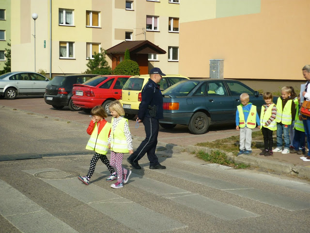 Celem spotkania było wyjaśnienie i przybliżenie dzieciom podstawowych zasad o ruchu drogowym: jak bezpiecznie przechodzić przez jezdnię, jak zachować się w pobliżu jezdni idąc chodnikiem, a jak korzystać z poboczy jezdni, na których chodnika nie ma.