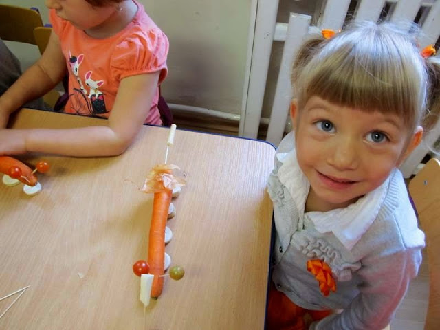 Dzieci ubrane na pomarańczowo poznawały walory zdrowotne, smakowe i estetyczne tego pięknego warzywa. Przekonały się, że marchewka doskonale smakuje na surowo, ale także w formie soku lub przecieru.