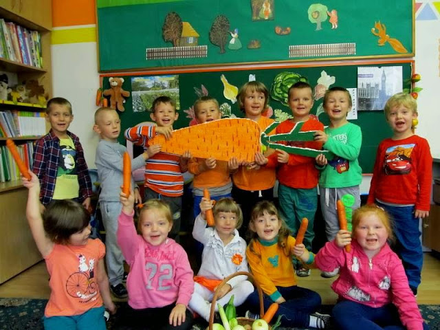Dzieci ubrane na pomarańczowo poznawały walory zdrowotne, smakowe i estetyczne tego pięknego warzywa. Przekonały się, że marchewka doskonale smakuje na surowo, ale także w formie soku lub przecieru.