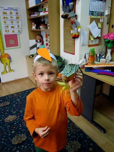 Dzieci ubrane na pomarańczowo poznawały walory zdrowotne, smakowe i estetyczne tego pięknego warzywa. Przekonały się, że marchewka doskonale smakuje na surowo, ale także w formie soku lub przecieru.