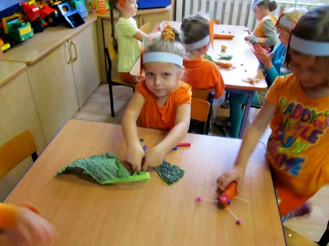 Dzieci ubrane na pomarańczowo poznawały walory zdrowotne, smakowe i estetyczne tego pięknego warzywa. Przekonały się, że marchewka doskonale smakuje na surowo, ale także w formie soku lub przecieru.