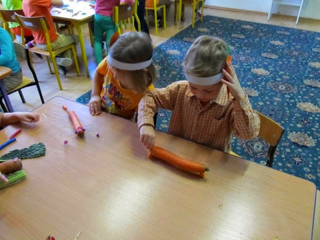 Dzieci ubrane na pomarańczowo poznawały walory zdrowotne, smakowe i estetyczne tego pięknego warzywa. Przekonały się, że marchewka doskonale smakuje na surowo, ale także w formie soku lub przecieru.