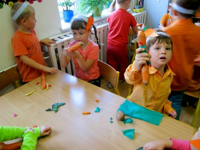 Dzieci ubrane na pomarańczowo poznawały walory zdrowotne, smakowe i estetyczne tego pięknego warzywa. Przekonały się, że marchewka doskonale smakuje na surowo, ale także w formie soku lub przecieru.