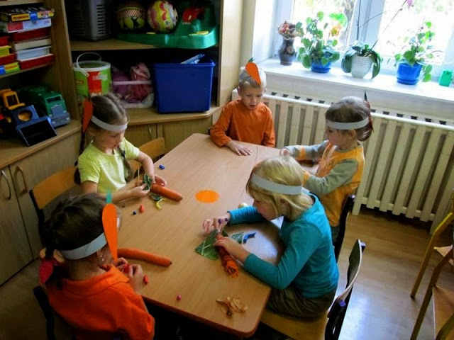 Dzieci ubrane na pomarańczowo poznawały walory zdrowotne, smakowe i estetyczne tego pięknego warzywa. Przekonały się, że marchewka doskonale smakuje na surowo, ale także w formie soku lub przecieru.