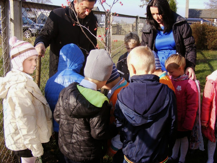 Miłą tradycją pierwszaków w dniu ślubowania jest wkopanie pamiątkowego drzewka, co też uczynili, oczywiście przy mocno grzejących dla nich promieniach słońca.