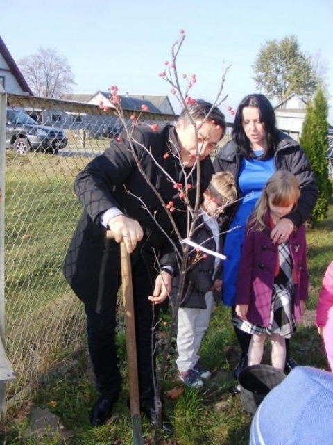 Miłą tradycją pierwszaków w dniu ślubowania jest wkopanie pamiątkowego drzewka, co też uczynili, oczywiście przy mocno grzejących dla nich promieniach słońca.