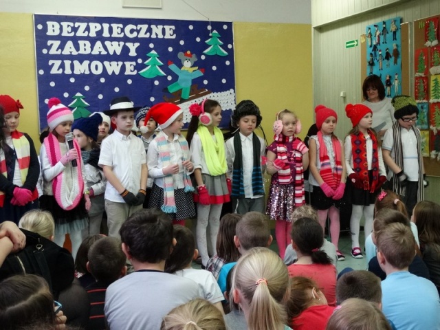 Dnia 15 stycznia uczniowie klasy I E z wychowawczynią p. Danutą Brzostek przygotowali apel dla uczniów klas I-III pt. "Bezpieczne zabawy zimowe".