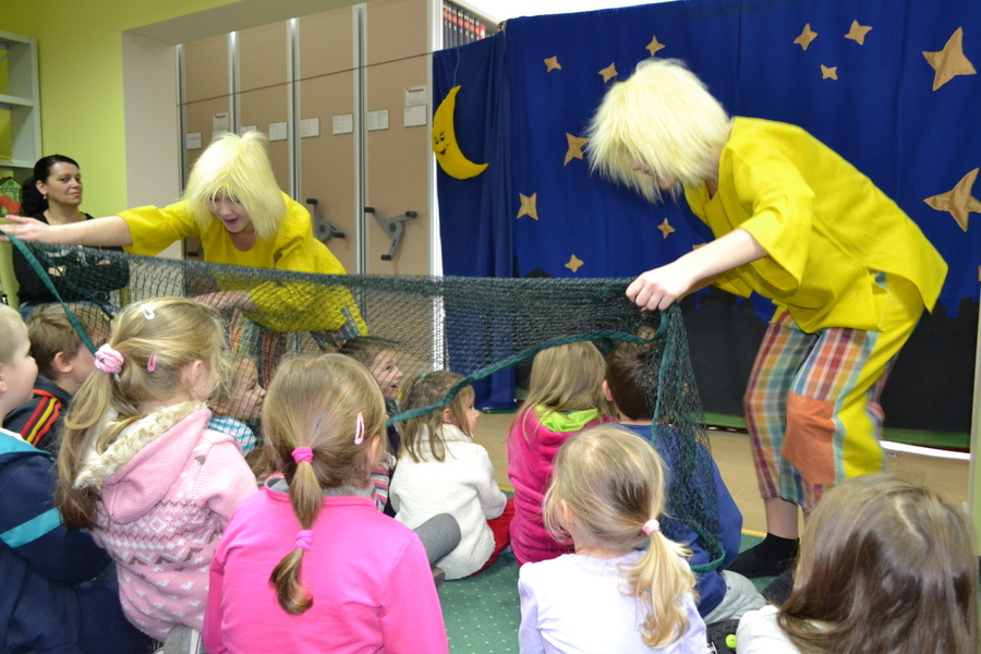 Artyści w humorystyczny sposób zapoznali małych widzów, którzy przybyli licznie tego dnia do biblioteki razem ze swoimi rodzicami i opiekunami, z burzliwymi przygodami słynnych bliźniaków, Jacka i Placka.
