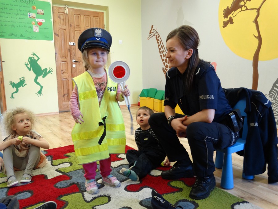 Rozmawiano o bezpieczeństwie a także o pracy i zawodzie policjanta. Dzieci mogły obejrzeć i przymierzyć niektóre elementy umundurowania funkcjonariuszy Policji, co cieszyło się dużym zainteresowaniem.