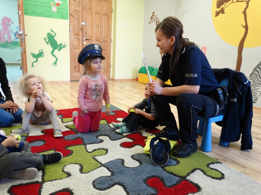 Rozmawiano o bezpieczeństwie a także o pracy i zawodzie policjanta. Dzieci mogły obejrzeć i przymierzyć niektóre elementy umundurowania funkcjonariuszy Policji, co cieszyło się dużym zainteresowaniem.