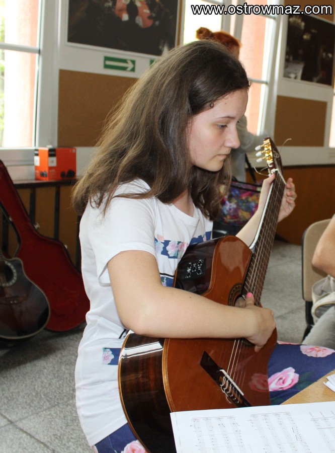 Dzieci i młodzież ćwiczy swoje umiejętności pod okiem nauczyciela gry na gitarze Janusza Spaulenoka.