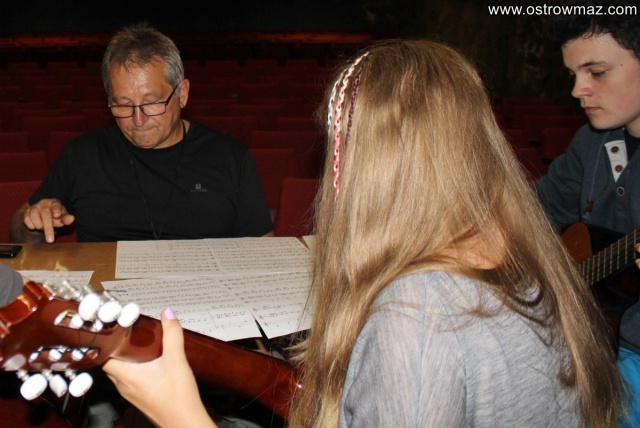 Dzieci i młodzież ćwiczy swoje umiejętności pod okiem nauczyciela gry na gitarze Janusza Spaulenoka.