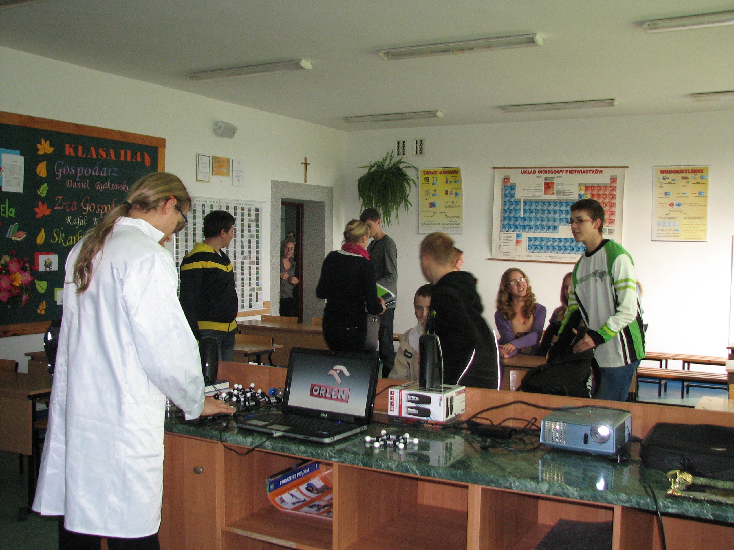 W programie pokazów chemicznych, które odbyły się 28.10.2013 r w Publicznym Gimnazjum Nr 2 w Małkini, Publicznym Gimnazjum w Zarębach Kościelnych i Gminnym Gimnazjum w Andrzejewie nie przewidziano fajerwerków i eksplozji, ale nikt nie narzekał na nudę.