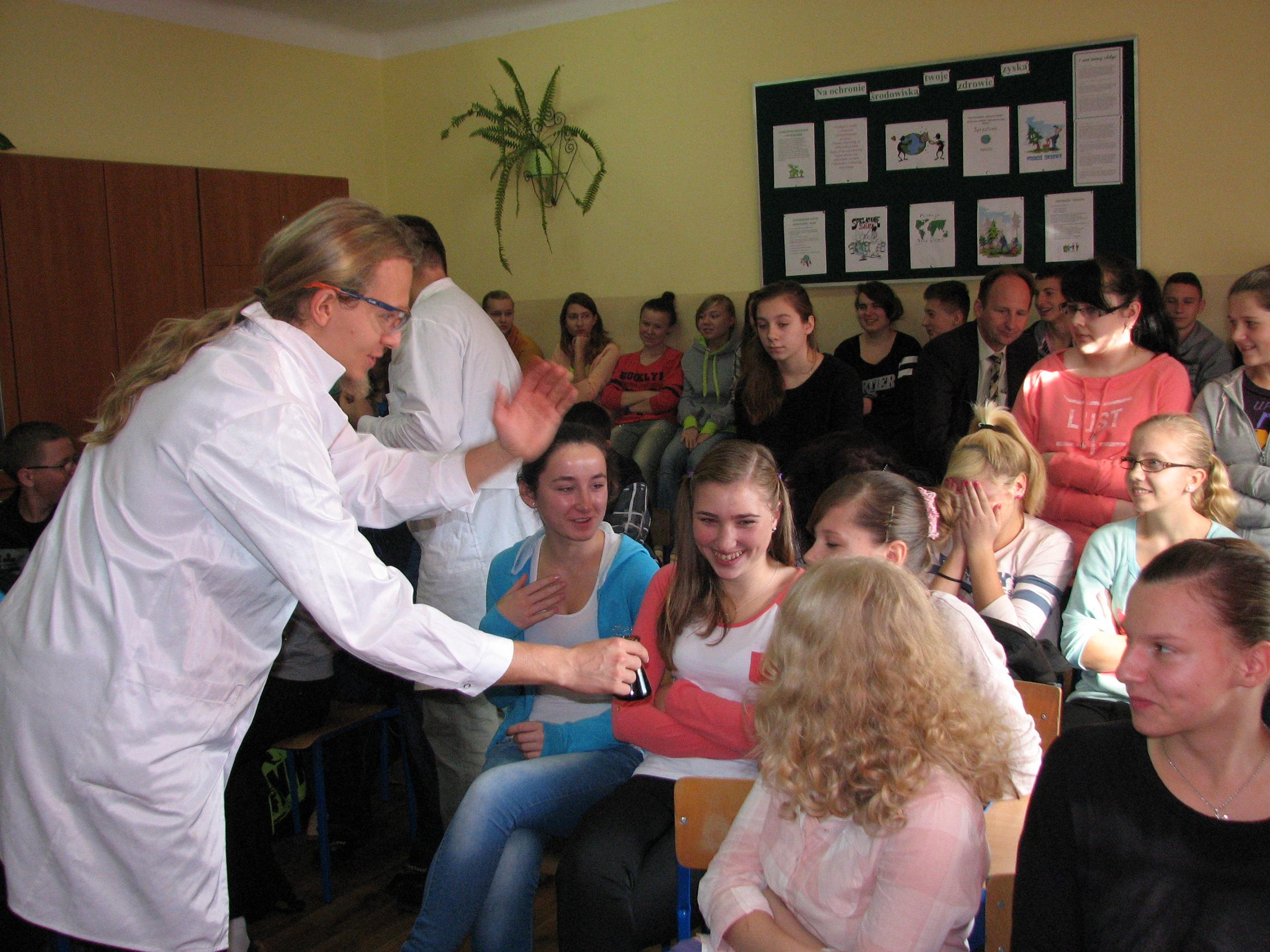 W programie pokazów chemicznych, które odbyły się 28.10.2013 r w Publicznym Gimnazjum Nr 2 w Małkini, Publicznym Gimnazjum w Zarębach Kościelnych i Gminnym Gimnazjum w Andrzejewie nie przewidziano fajerwerków i eksplozji, ale nikt nie narzekał na nudę.
