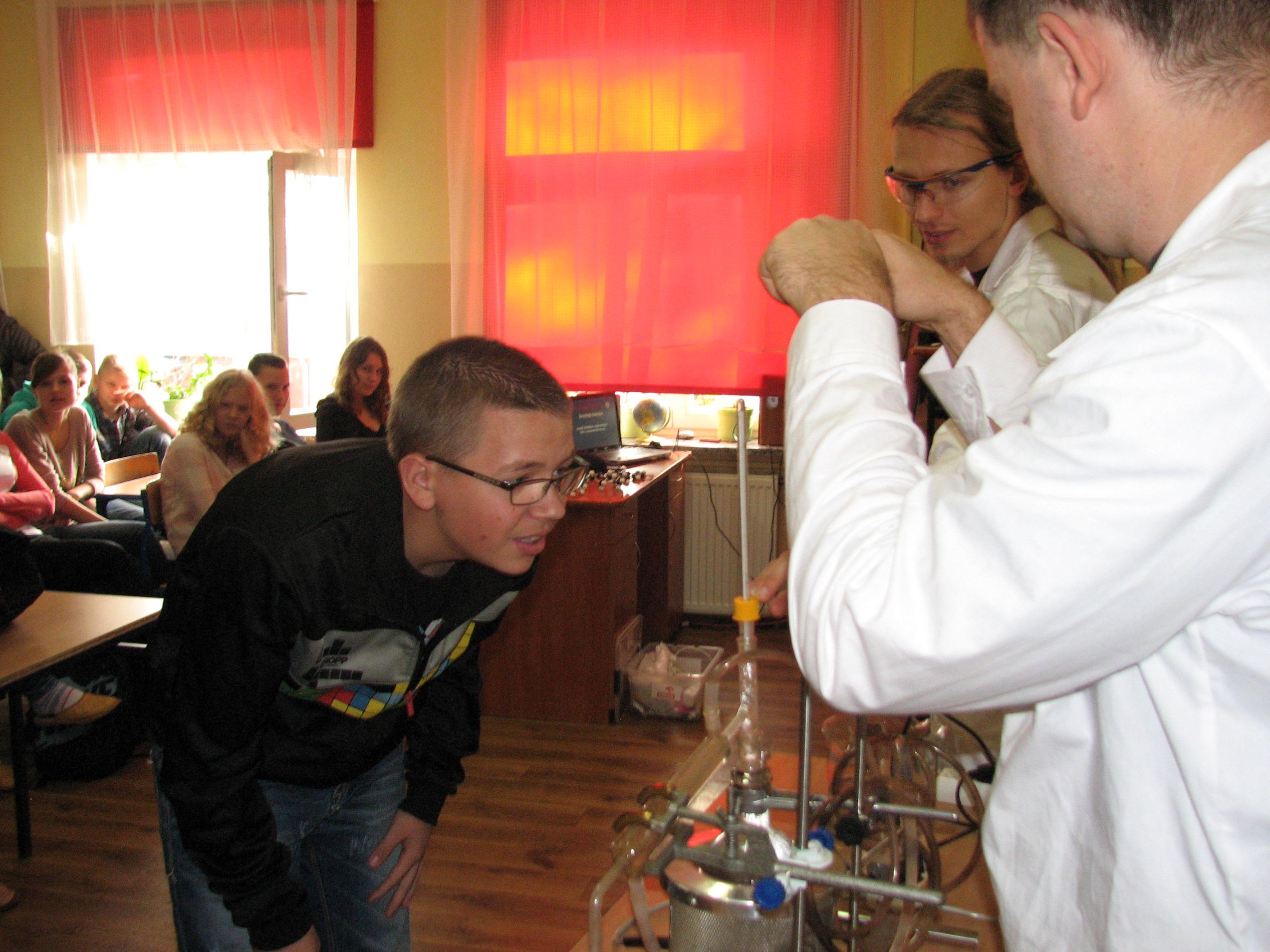 W programie pokazów chemicznych, które odbyły się 28.10.2013 r w Publicznym Gimnazjum Nr 2 w Małkini, Publicznym Gimnazjum w Zarębach Kościelnych i Gminnym Gimnazjum w Andrzejewie nie przewidziano fajerwerków i eksplozji, ale nikt nie narzekał na nudę.