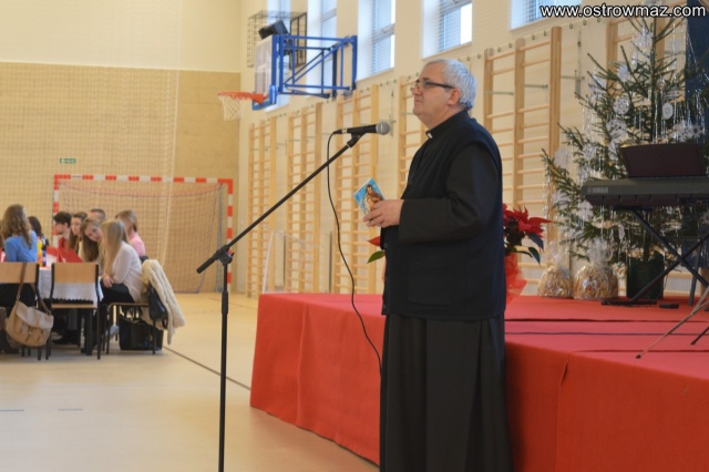 Tegoroczna wigilia szkolna w L.O. im Mikołaja Kopernika odbyła się na niedawno wybudowanej hali sportowej. Zgromadzili się tam nauczyciele, pracownicy szkoły, delegacje wszystkich klas oraz zaproszeni goście.