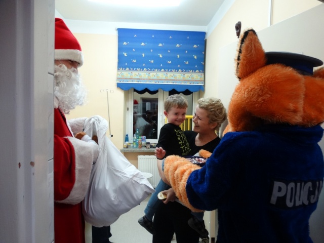 Święty Mikołaj z pomocnikami i Policyjnym Liskiem odwiedzili w piątek dzieci przebywające na oddziale pediatrycznym w ostrowskim szpitalu. Maluchy otrzymały pluszowe misie i słodycze.