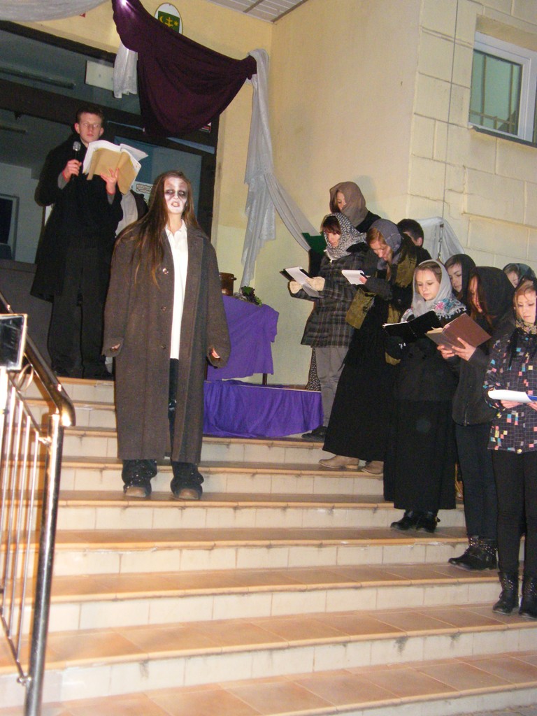27 listopada przed budynkiem PG3 dwudziestu uczniów przedstawiło inscenizację "Dziady - cz. II" w ramach projektu edukacyjnego.