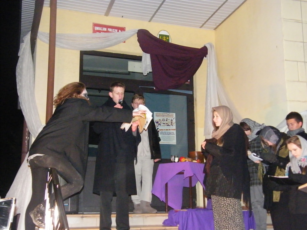 27 listopada przed budynkiem PG3 dwudziestu uczniów przedstawiło inscenizację "Dziady - cz. II" w ramach projektu edukacyjnego.